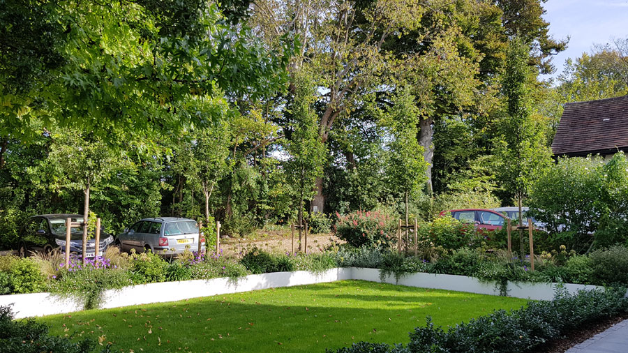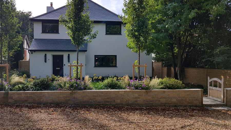 A major house and garden renovation. Our clients wanted materials that was high quality and reflect the local architecure. The completed front garden has a lawn, mature ornamental pear trees and lots of stylish planting from a restrained pallete. They wanted the parking area kept distinct from the garden, so they have a nicer view from the house.
