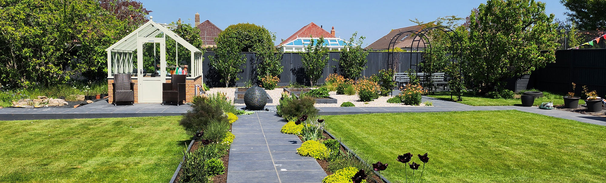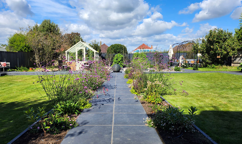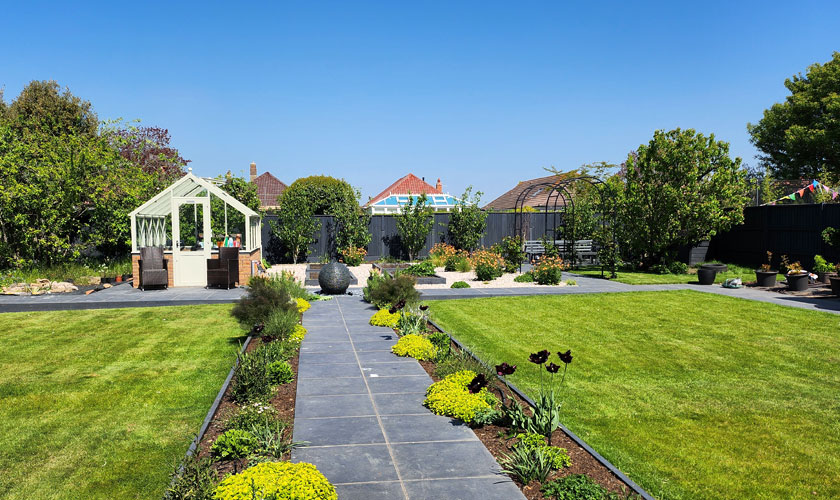 To the rear, a modern outdoor lounge provides a private retreat framed with lush planting, while fruit trees and new multi-stem silver birches soften the boundaries. The design combines classic formality with contemporary touches, giving the garden year-round interest and a strong sense of flow between its different zones.