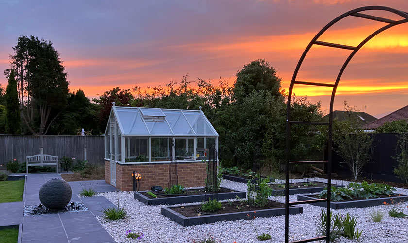 On one side, a greenhouse and raised beds offer space for growing fruit and vegetables, complemented by a small seating area for morning coffee among the plants, affording different views of the garden.