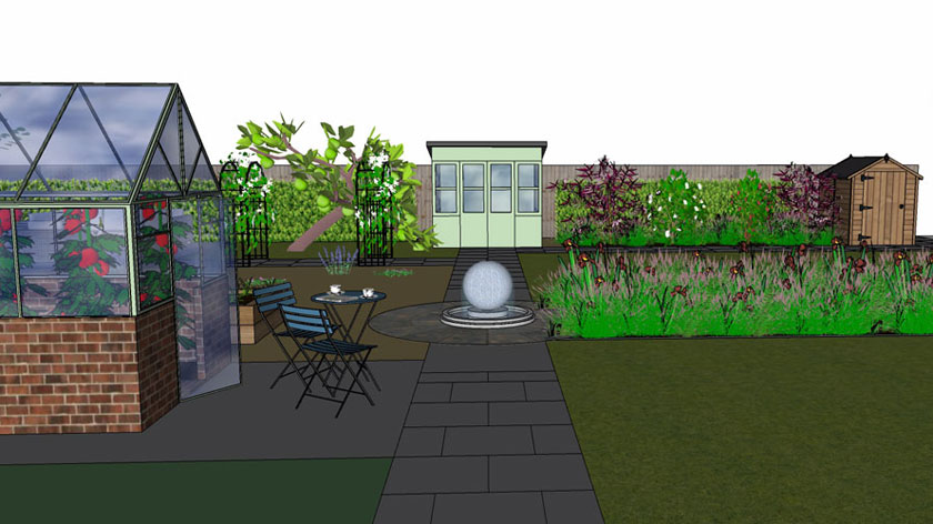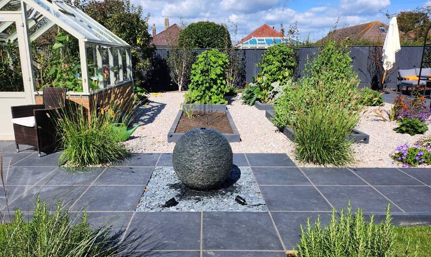 This garden blends structure and softness to create a balanced, welcoming outdoor space. At its heart, a slate fountain draws the eye along a central axis, while lawns and neatly edged borders provide symmetry and calm.
