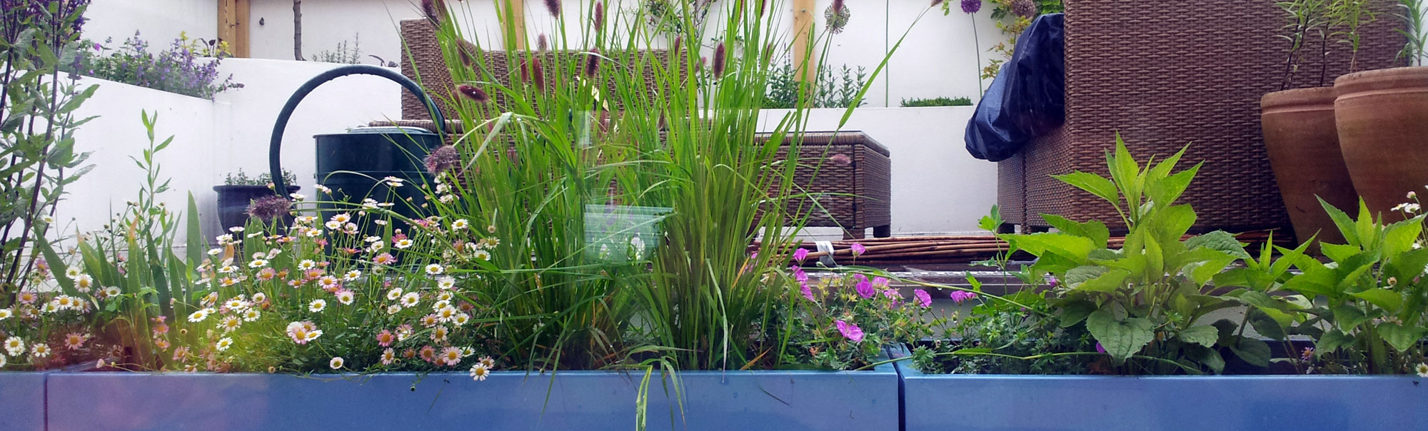 The brief was to create a modern beautiful garden, full of plants, but also reflecting the client's preference for modern materials. The view through the kitchen window was central to the design, so bespoke colour coded planters were introduced, bringing the planting much closer to the house.
