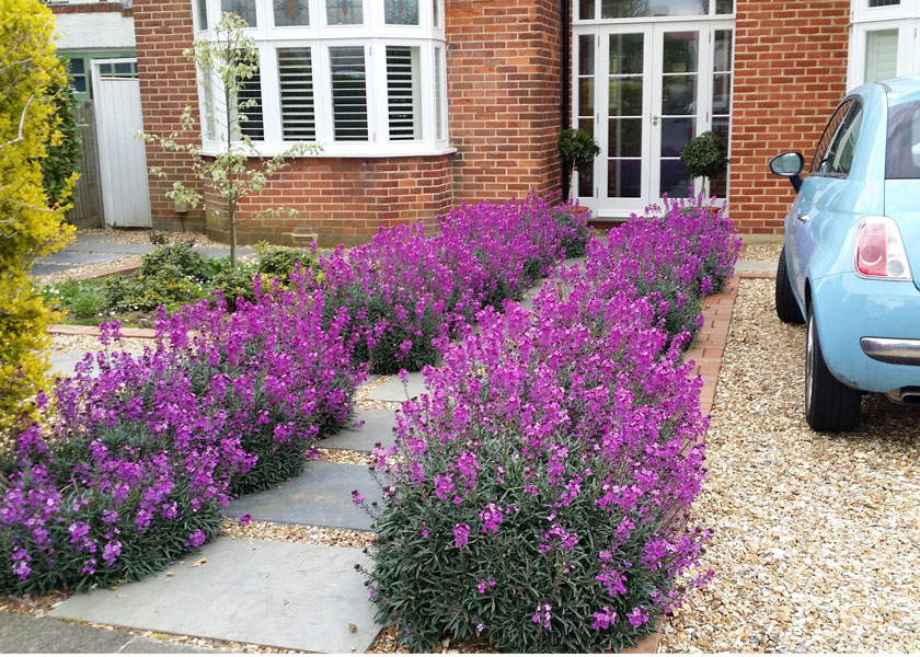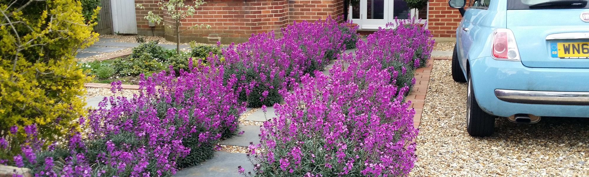 Our clients wanted to smarten up their drive whilst retaining the feeling of a garden. Clay pavers, gravel and over-sized slates were used to form the path. A long flowering hedge either side really lifted the mood of the space, and a formal planting bed with a small tree brought colour and flower power.