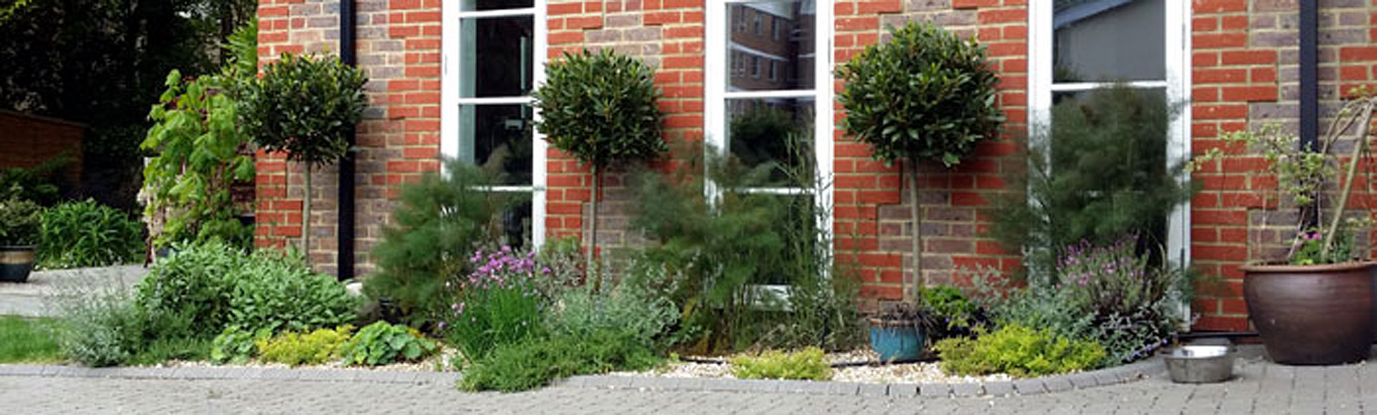 A herb garden with evergreens and structural planting softens the look of the house and drive, which had just been laid to block paving.